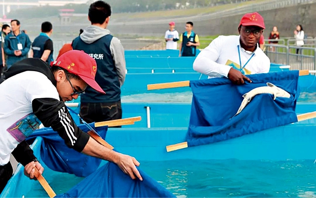 中外志愿者在运送中华鲟 图/喻 捷