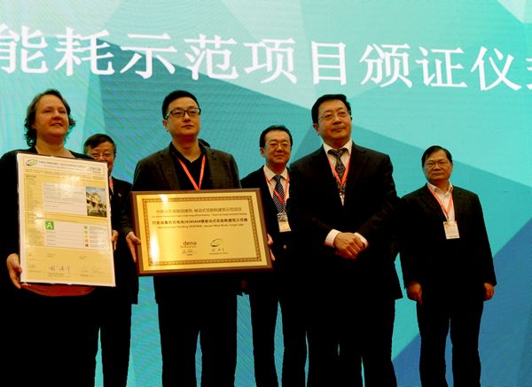 住房和城乡建设部科技与产业发展中心主任俞滨洋(右二)向获得被动式低能耗建筑示范项目的企业颁发证书