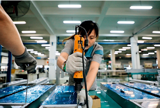 在沈阳生产了67部俄罗斯世界杯比赛场电梯的民营企业。图为电器车间,装配工徐女士正在用电动螺丝刀给电梯操作盘上螺丝