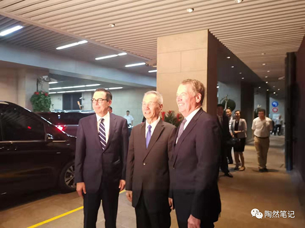 “夜色下的浦江两岸凉风习习,8点05分,刘鹤副总理与美国贸易代表莱特希泽、财政部长姆努钦登上了和平饭店九楼的露台共览浦江。这里还有一个小细节,刘鹤副总理与莱特希泽、姆努钦在露台上还转过身来以陆家嘴夜景作为背景拍照留念。——澎湃新闻《八点零五分,共览浦江》”