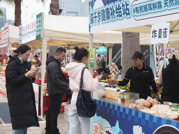 在演唱会开始前,市集就已提前预热,为歌迷和本地市民打造了一个绝佳的“周末好去处”。场馆外的喷泉广场上,许多歌迷早早聚集在一起,在印有歌手照片的应援展板前拍照留念。在市集现场,壮锦、绣球、麽乜等当地非遗手工艺品吸引着不少观众围观挑选;老友粉、酸嘢、五色糯米饭等美食摊位更是大排长龙,现场气氛十分热烈。“我是专程来南宁看演唱会的,没想到场馆外也这么热闹精彩!我刚在这里买了老友粉,特别好吃。”来自广东的龚女士兴奋地告诉记者:“在我看来,品尝当地美食是了解一个城市最直接的方式。”