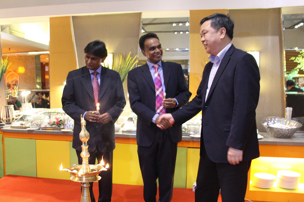 印度驻华大使馆公使B. Bala Bhaskar,亚洲基础设施投资银行副行长、首席投资官D. J.Pandian,首旅建国酒店管理有限公司总裁袁首原三人共同为活动点亮祝福的油灯