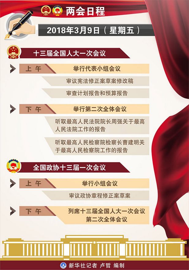 新华社北京3月8日电 十三届全国人大一次会议9日上午举行代表小组会议,审议宪法修正案草案修改稿,审查计划报告和预算报告。下午3时在人民大会堂举行第二次全体会议,听取最高人民法院院长周强关于最高人民法院工作的报告,听取最高人民检察院检察长曹建明关于最高人民检察院工作的报告。