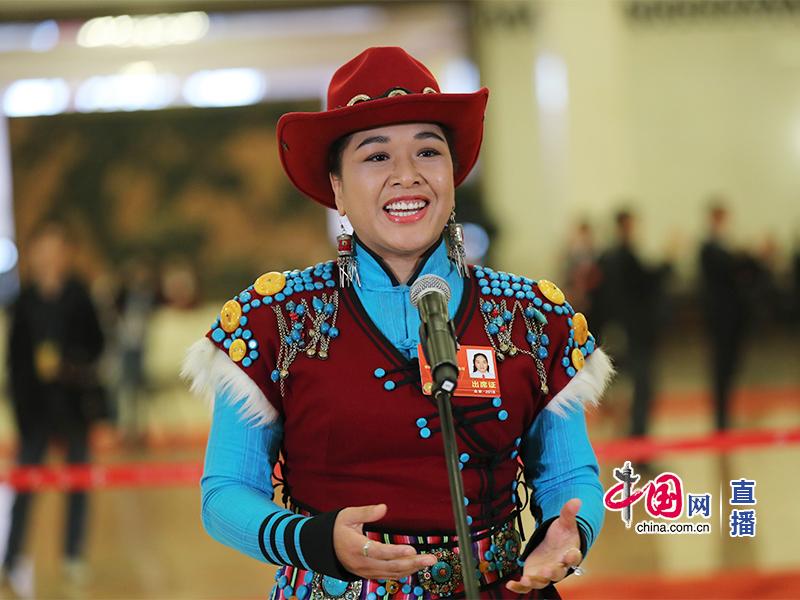 3月10日,全国政协十三届一次会议举行“委员通道”采访活动。来自少数民族界的全国政协委员、云南怒江傈僳族自治州民族文化工作团演员茸芭莘那回答记者提问。中国网 董宁 摄