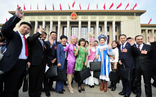 01-2018年3月5日, 十三届全国人大一次会议在人民大会堂开幕。全国人大代表们步入会场前向媒体挥手致意。董宁摄影
