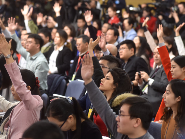 04-2018年3月6日,十三届全国人大一次会议新闻中心内举手提问的国外女记者。董宁摄影。