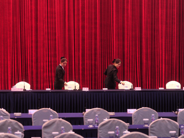 05-2018年3月6日,十三届全国人大一次会议广东代表团举行全体会议。会议开始前女服务员在忙碌中。董宁摄影