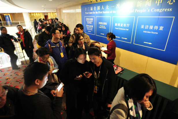 06-2018年3月7日,早晨7点半,几位女记者在新闻中心门前排队等待入场。董宁摄影