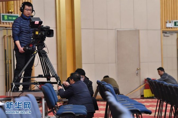 2月27日,工作人员在全国两会新闻中心的新闻发布厅内调试转播设备。新华社记者 李鑫 摄
