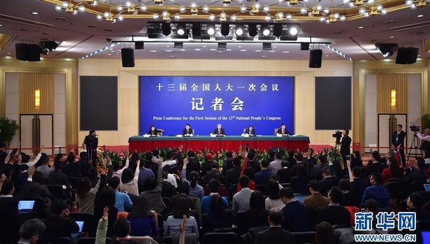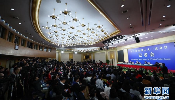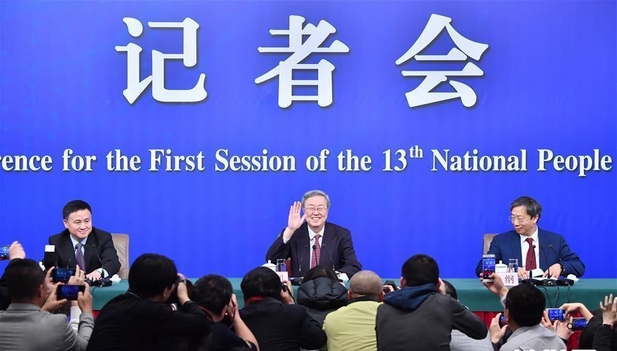 3月9日,十三届全国人大一次会议新闻中心举行记者会,邀请中国人民银行行长周小川、副行长易纲、副行长兼国家外汇管理局局长潘功胜就“金融改革与发展”的相关问题回答中外记者提问。新华社记者 张玉薇 摄