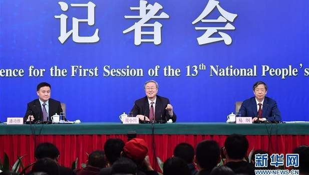 3月9日,十三届全国人大一次会议新闻中心举行记者会,邀请中国人民银行行长周小川、副行长易纲、副行长兼国家外汇管理局局长潘功胜就“金融改革与发展”的相关问题回答中外记者提问。新华社记者 李鑫 摄