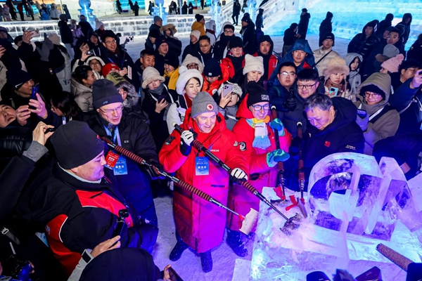 活动期间,嘉宾们在冰雪大世界特设的“冰雕体验区”,参与“冰雪之约 雕刻世界”沉浸式体验活动,亲手在冰材上雕刻“世界市长对话”活动标识,在互动中感受冰雕文化的独特魅力。