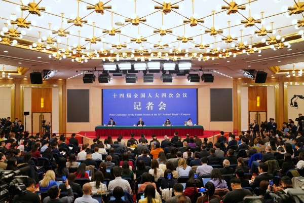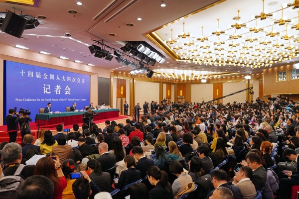 3月8日,十四届全国人大四次会议在北京梅地亚中心新闻发布厅举行外交主题记者会。这是中外记者提问。