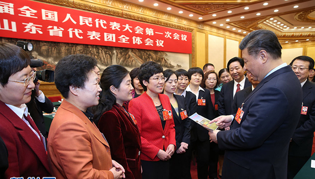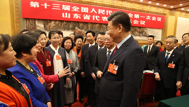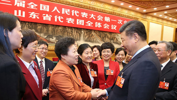 3月8日,中共中央总书记、国家主席、中央军委主席习近平参加十三届全国人大一次会议山东代表团的审议。在“三八”国际劳动妇女节到来之际,习近平代表党中央,向参加全国两会的女代表、女委员、女工作人员,向全国各族各界妇女同胞,致以节日的祝贺和诚挚的祝福。这是习近平同女代表亲切交谈。新华社记者 姚大伟 摄
