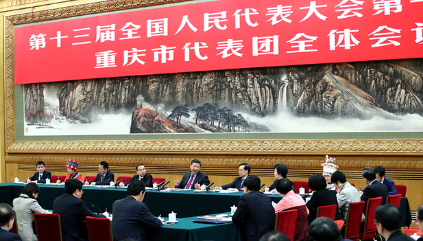 3月10日,中共中央总书记、国家主席、中央军委主席习近平参加十三届全国人大一次会议重庆代表团的审议。 新华社发(盛佳鹏 摄)