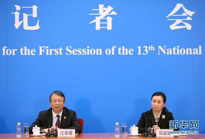 3月11日,十三届全国人大一次会议秘书处法案组组长、全国人大常委会法工委主任沈春耀(左),法案组副组长、全国人大常委会法工委副主任郑淑娜就宪法修正案相关问题回答中外记者提问。新华社记者金立旺摄