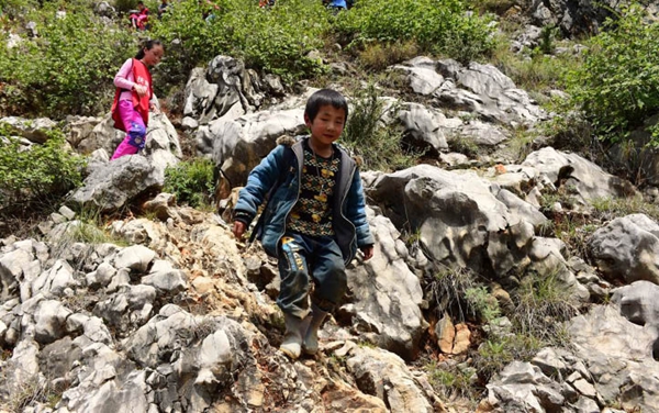 贵州省威宁县的乡村儿童每天要沿着崎岖危险的山路步行两个多小时去上学