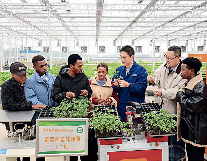 2025年10月31日,浙江金华,金华职业技术大学的非洲留学生在双龙实验室蔬菜农艺农机融合示范试验基地开展蔬菜种苗嫁接机操作实训